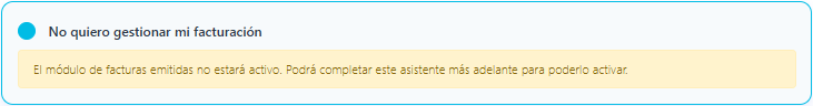 • No quiero gestionar mi factura. Selecciona esta opción si vas a usar SoportNet para otros módulos distintos al módulo de facturas de venta. Nunca podrás generar una factura o factura simplificada.