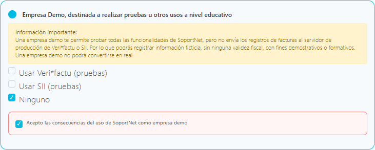 • Empresa Demo. Selecciona esta opción si vas a usar SoportNet con fines demostrativos o formativos. Una vez seleccionada, podrás activar Veri*factu o SII en modo pruebas. Recuerda que esta opción estará fuera de la normativa legal, por lo que cualquier uso distinto al demostrativo o formativo será responsabilidad del usuario.