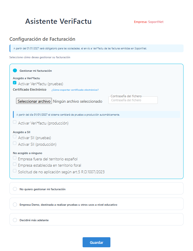 • Gestionar mi facturación. Selecciona esta opción si vas a gestionar facturas de venta en SoportNet. Una vez seleccionada podrás acogerte Veri*factu, SII o ninguno: